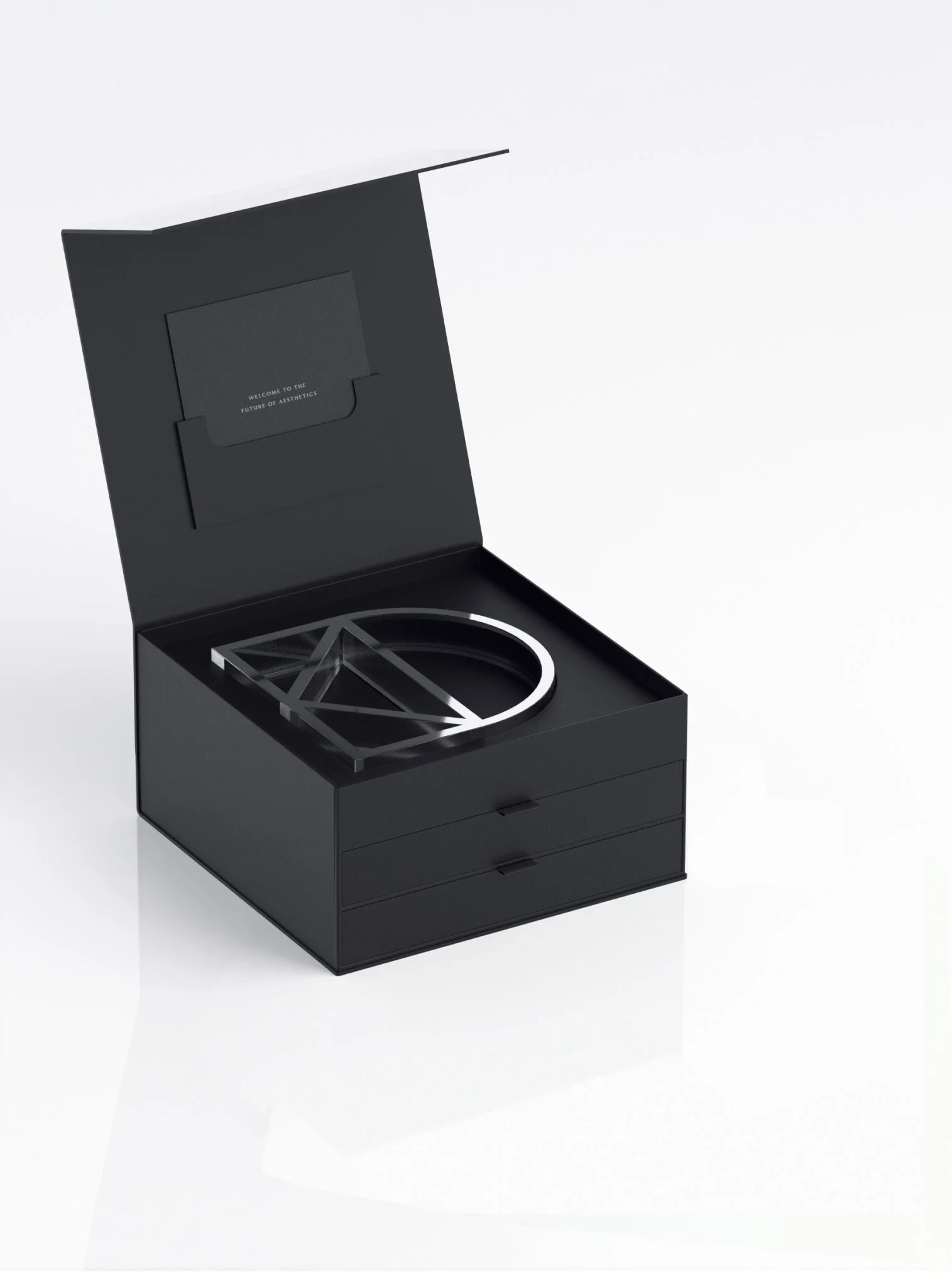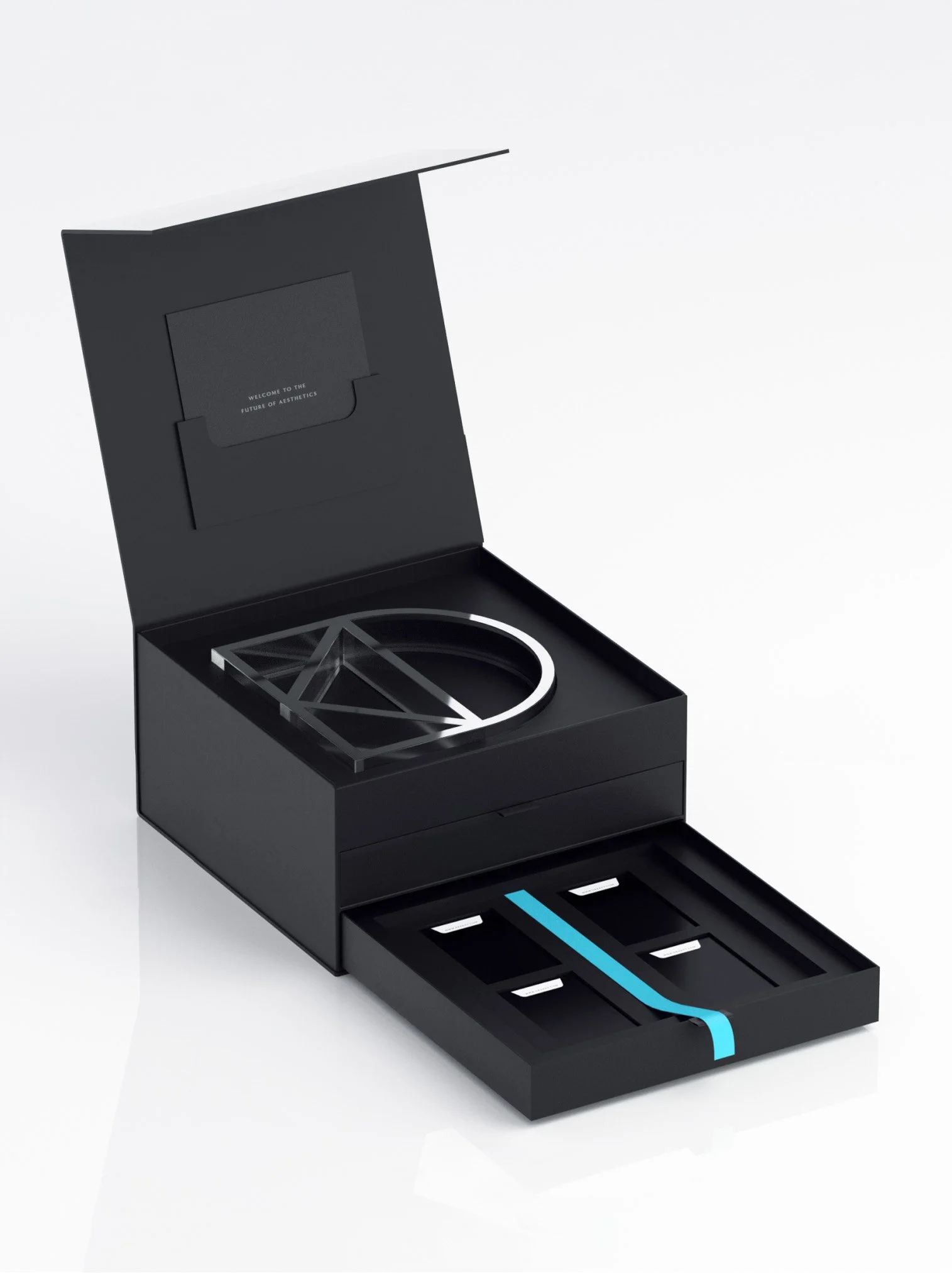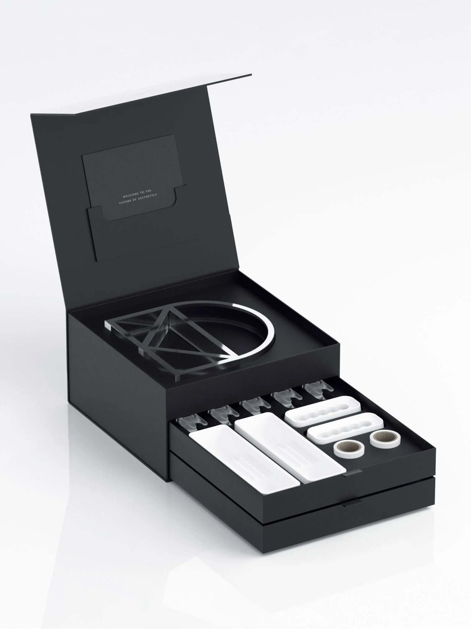 I created the luxe welcome box for the brand’s exclusive early adopters. To set the tone, the first level of the box opens to a welcome letter, coated in embossed leather-like paper, accompanied by a metallic lucite emblem for the practice.
